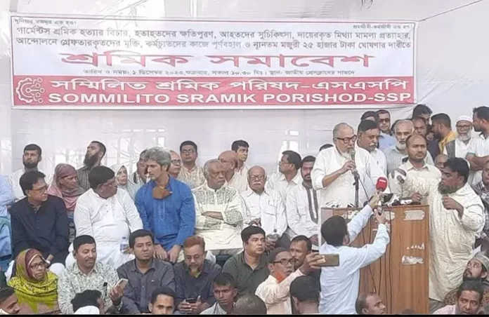 ‘গার্মেন্টস শ্রমিক হত্যার বিচার, হতাহতদের ক্ষতিপূরণ, মামলা প্রত্যাহার, ন্যূনতম মজুরি ২৫ হাজার টাকা ঘোষণার দাবিতে’ এ সমাবেশ অনুষ্ঠিত হয়।শ্রমিকরা ন্যায্য মজুরির আন্দোলন করলে কারখানা বন্ধের ভয় দেখানো হয় অভিযোগ করে নজরুল ইসলাম খান বলেন, শ্রমিকের মজুরি যা বাড়ে জিনিসপত্রের দামসহ জীবনযাত্রার ব্যয় বাড়ে তার চেয়ে বেশি। সরকার বাজার নিয়ন্ত্রণে ব্যর্থ। শ্রমিকদের অধিকার রক্ষায় ব্যর্থ।