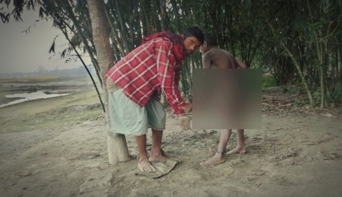 শনিবার  (০৩ ফেব্রুয়ারি  ) সকালে সরেজমিনে গিয়ে দেখা যায়, শিশু রাকিবের পায়ে লোহার শিকল ও তালা লাগিয়ে গাছের সঙ্গে বেঁধে রাখা হয়েছে। প্রচণ্ড শীতে উদোম শরীরে সারাদিন গাছের চারপাশে ঘুরছে। মানুষ দেখলেই শেকল দেখিয়ে খুলে দেওয়ার ইশারা করে সে।