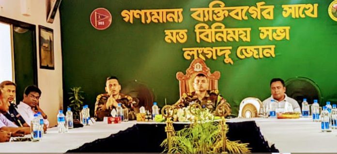 উক্ত মত বিনিময় সভায় জোন অধিনায়ক লেঃ কর্ণেল হিমেল মিয়াসহ অন্যান্য অফিসারবৃন্দ উপস্থিত ছিলেন। এছাড়াও উপস্থিত ছিলেন লংগদু উপজেলা পরিষদের চেয়ারম্যান ও বাংলাদেশ আওয়ামীগের উপজেলা সাধারন সম্পাদক জনাব বাবুল দাশ (বাবু), উপজেলা আওয়ামীলীগের ভারপ্রাপ্ত সভাপতি জনাব মোঃ সেলিম সরকার, জাতীয়তাবাদী দলের (বিএনপি) উপজেলা সভাপতি জনাব মোঃ তোফাজ্জল হোসেন, সাধারন সম্পাদন জনাব মোঃ কালাম সওদাগর, আব্দুল বারেক দেওয়ান, এবং উপজেলা জামায়াতে ইসলামীর আমীর মাওলানা মোঃ নাছির উদ্দীন। তাছাড়া বিভিন্ন প্রতিষ্ঠানের প্রধান, বাজার কমিটির নেতৃবৃন্দ, প্রেসক্লাবের সদস্যবৃন্দ এবং গন্যমান্য ব্যাক্তিবর্গ ও উপস্থিত ছিলেন।